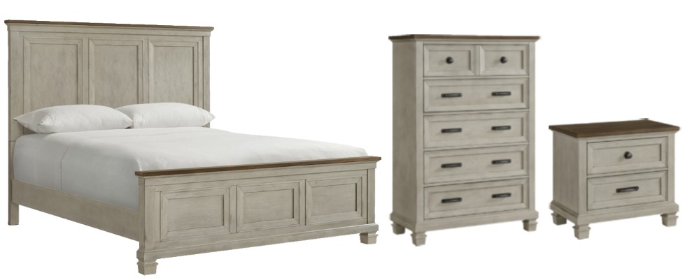 The two-tone design in medium brown and washed stone adds a touch of farmhouse style to each piece. The three-panel headboard and footboard exude elegance, while the nightstand features a convenient USB port for easy charging. Every top drawer comes with brown felt lining and bottom drawers with lined cedar. They also include ball bearing drawer guides and French dovetail at the front and English dovetail at the back, making this set one that is built to last. Upgrade your space with the Farmington bedroom collection today.