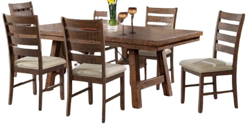 The Jax dining set makes entertaining easy. Its cherry finish and earthy wood grain detail create an organic look that's both inviting and relaxing. Flared legs, turnbuckle metal accents, and ladder back side chair add a flavor to this charming set.Read More