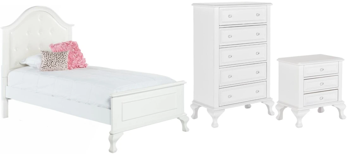 The charming Jesse bed guarantees your little one sweet dreams. Its beautifully crafted bed features a faux leather headboard adorned with chic white buttons. Beautifully arched cabriole feet and crystal-like knobs accent its lovely case pieces while a roll-out bed trundle allows easy access to storage.Read More