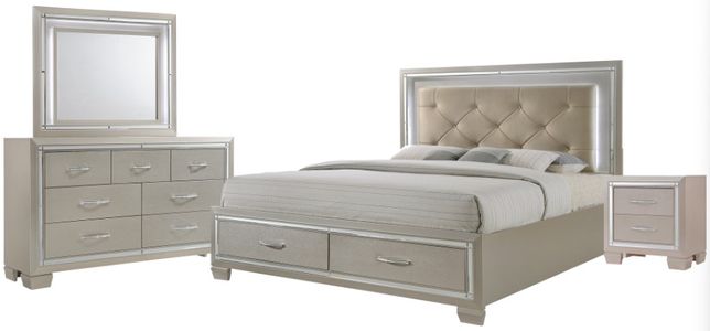 The Platinum king platform storage bedroom set glams up your bedroom. Its chic champagne finish is accented by a decorative mirror trim throughout. Stylish, chrome nail heads and faux leather are used in its high fashion diamond upholstered headboard. Enjoy this collections mood lighting featured in and the headboard.Read More