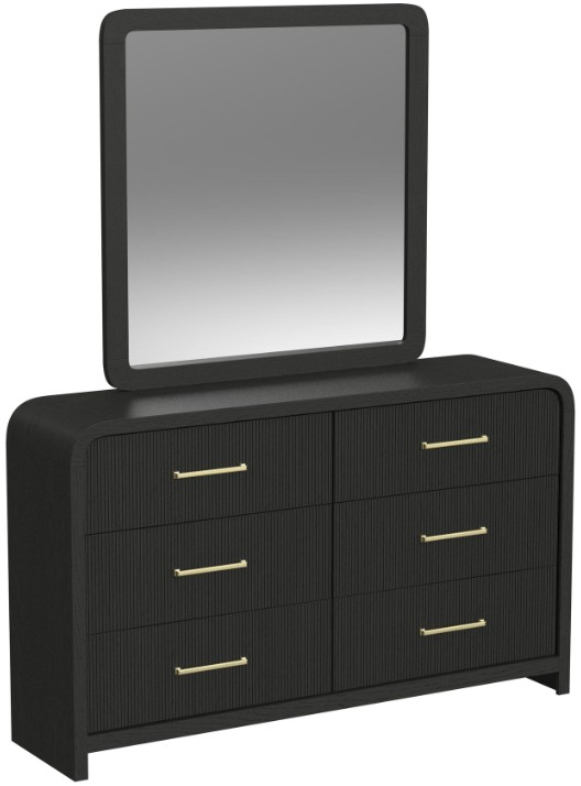 The Ridgemont dressing table and mirror features gently rounded table corners, while the black finish of the high-quality engineered wood. Fluted detailing on drawer fronts creates an aesthetic focal point, accentuated by the sleek, metal drawer pulls. Accented with a rounded, framed mirror that lends itself to practical, daily use.Read More