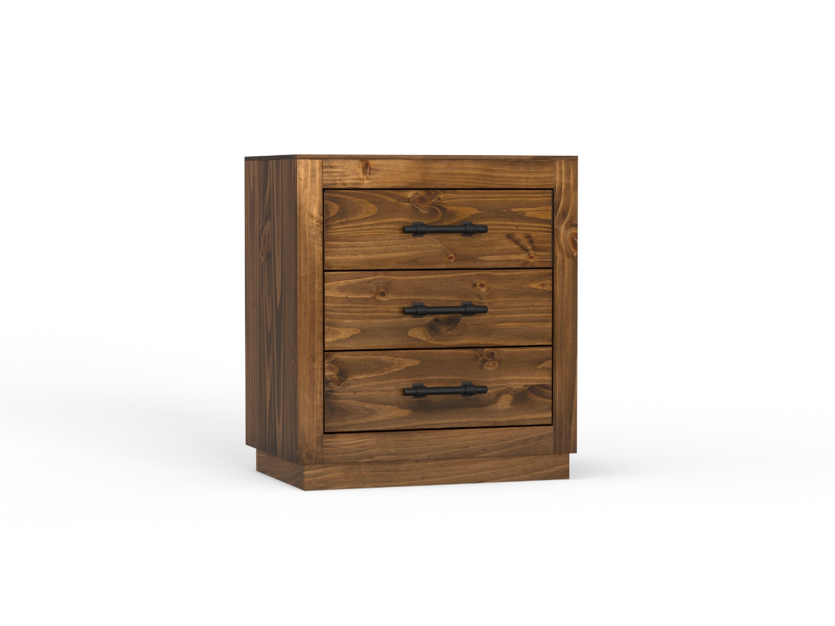 The Enid Nightstand perfectly complements the rustic charm of the Enid Bed. Crafted from solid pine with a brown rub-through finish, this nightstand features three spacious drawers with black hardware. Ball bearing glides ensure smooth operation, while rasp marks, rub marks, and intentional dents showcase the natural beauty of the wood. This piece brings warmth and character to your bedroom, blending functionality with traditional style.Read More