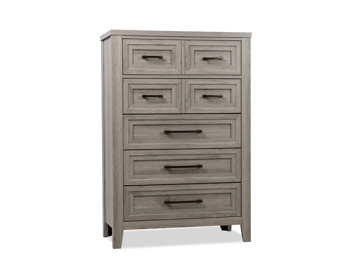 The Franklin Chest is a stylish and practical addition to your bedroom. Crafted with a gray wood veneer, this chest features five spacious drawers, providing ample storage for your clothing and accessories. Each drawer is adorned with square detailing on the fronts, adding a subtle yet elegant touch to the design. The black hardware contrasts beautifully with the gray finish, enhancing the chest's modern appeal. With its clean lines and sophisticated detailing, the Franklin Chest not only offers functionality but also elevates the overall aesthetic of your bedroom.Read More
