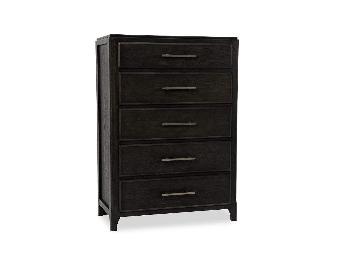 The Geary Chest offers bold design and practical storage, making it a versatile addition to your bedroom. Crafted from rubberwood solids and oak veneers in a sleek black finish, this chest combines durability with a modern, sophisticated look. Silver hardware provides a striking contrast, while clean lines give the piece a timeless appeal that works in both contemporary and transitional spaces.Read More