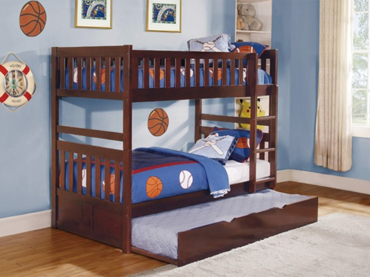 The Georgia Twin/Twin Bunk Bed with Trundle is a stylish and space-saving solution for shared bedrooms or overnight guests. With its transitional design and rich dark cherry finish, this bunk bed adds warmth and sophistication to any room. Crafted from pine veneer, it offers a sturdy, dependable frame that’s built to last. A built-in ladder provides safe and easy access to the top bunk, which is equipped with guard rails for added security, making it a great choice for kids or teens.Read More