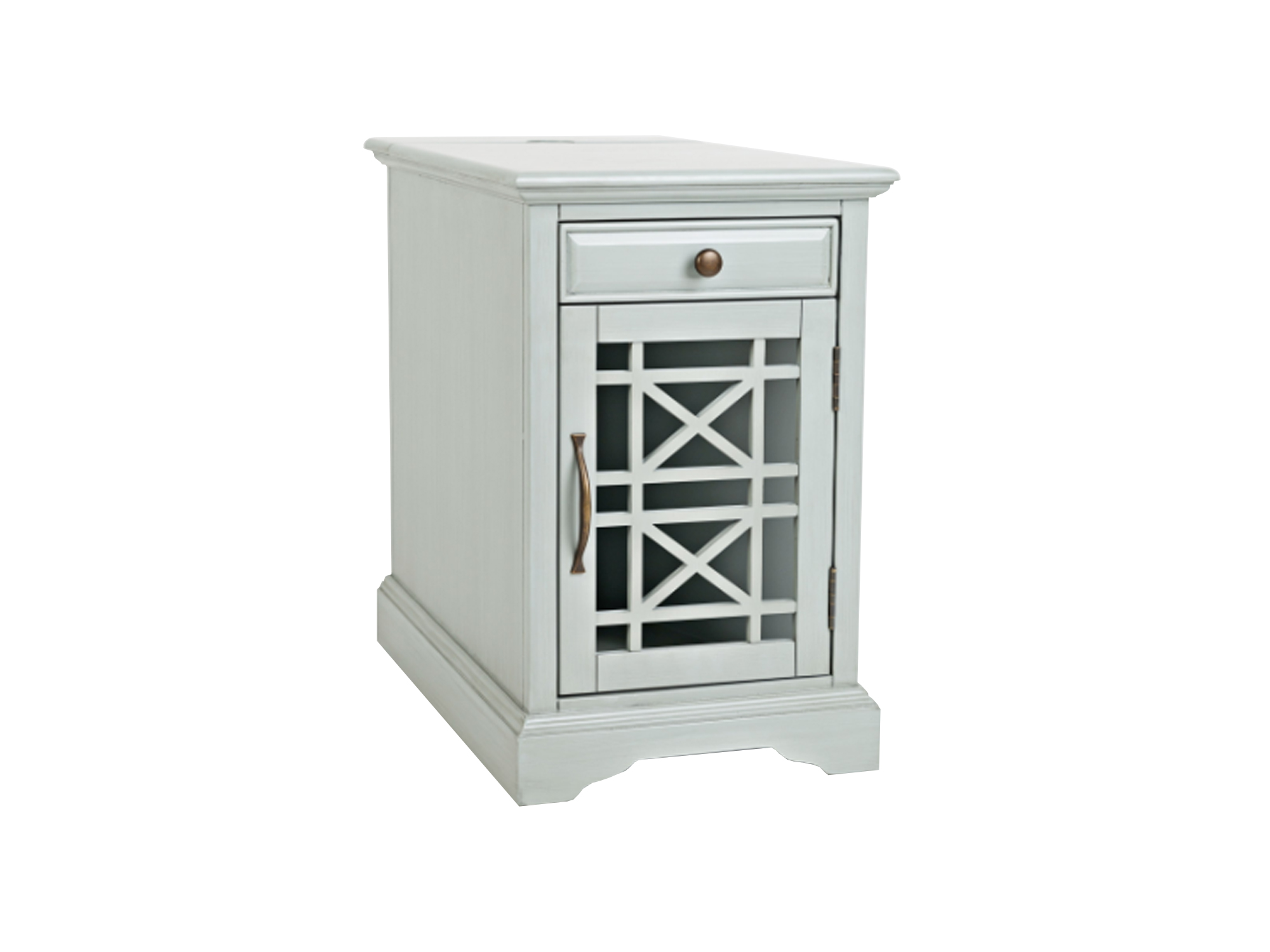 This power chairside table is as useful as it is beautiful. It looks incredible with a carefully aged finish, cabinet door fretwork, and antique hardware, but it's the hidden charger and easy storage that makes it a real treasure. Charge your tablet and plug in a lamp without have a tangle of cords. Power Unit has two outlets and two USB ports.