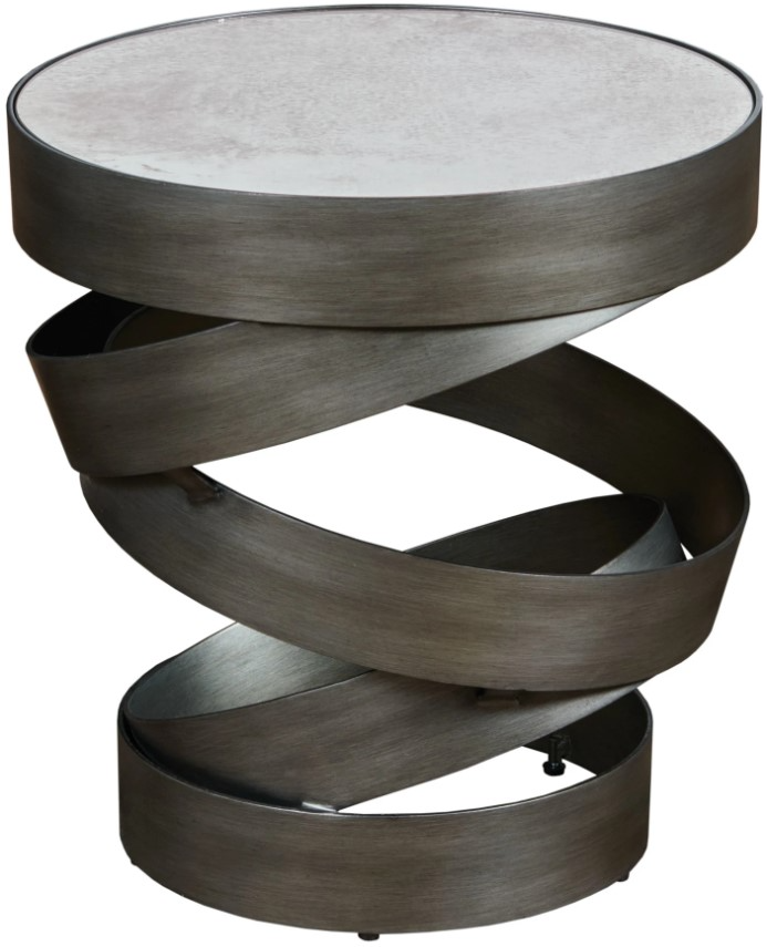 Add a striking accent to your space with this round table featuring an antique mirror top and sculptural gunmetal base. The reflective surface enhances light while the helix-inspired design creates visual interest. Perfect for modern interiors, it combines artistic style with everyday functionality in compact form.Read More