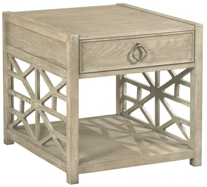 Casual transitional group by utilizing everyday transitional styling and incorporating it with casual elements and accent pieces. Drawer end table has geometric grids on the ends, drawer and shelf for additional storage with a wonderful soft gray tones of the oyster finish.Read More