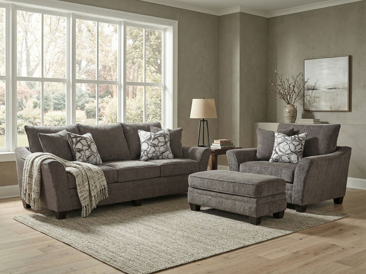 This set includes thoughtful design elements like soft, matching throw pillows in both solid brown and a cream abstract circle pattern that adds a subtle pop of contrast. The rectangular ottoman completes the collection, offering a comfortable footrest or extra seating as needed. Made in the USA with a mix of domestic and imported materials, the Jocelyn set brings lasting value, comfort, and cohesion to your home.