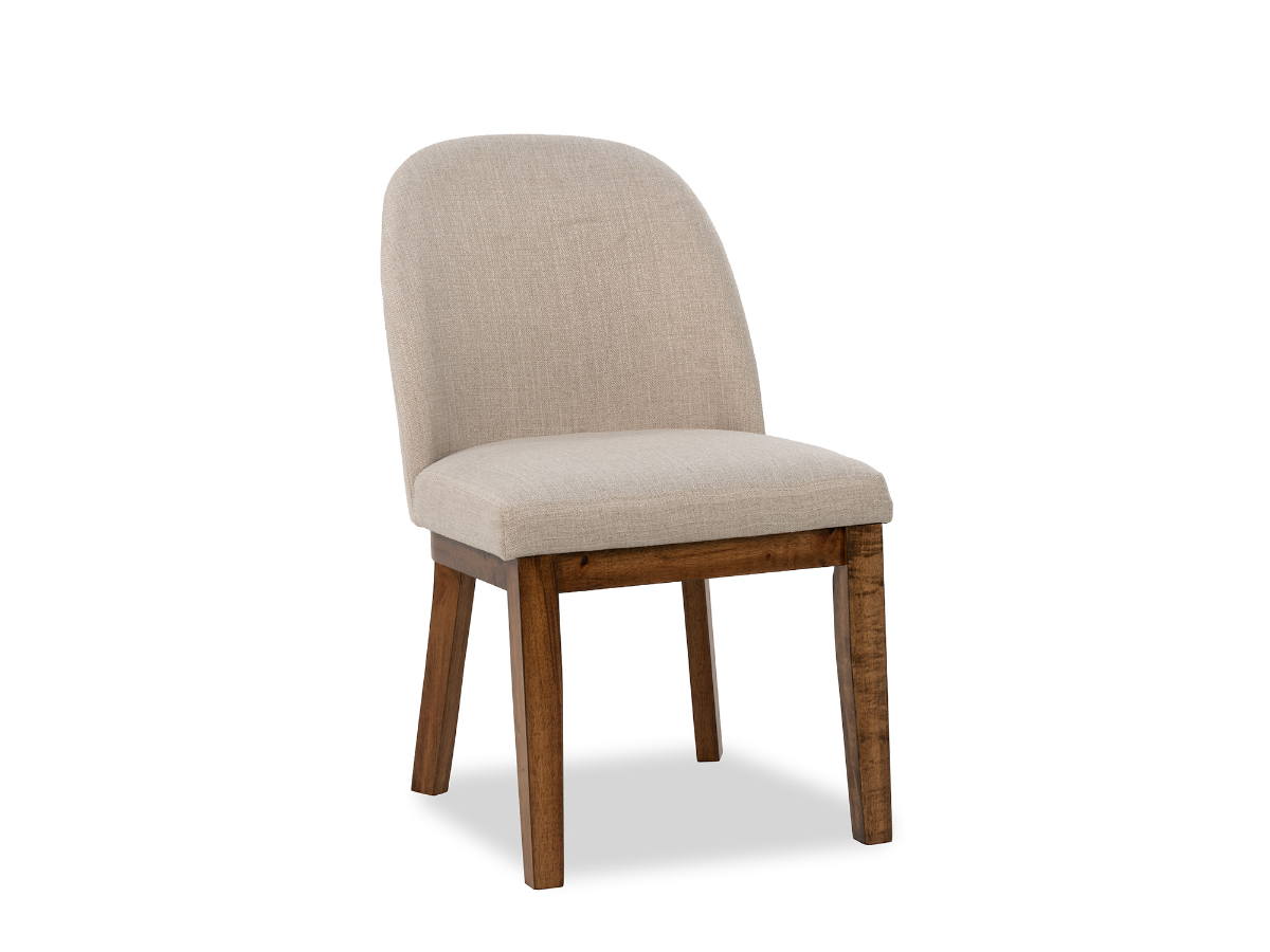The Joplin Side Chair blends soft elegance with sturdy craftsmanship, making it a versatile choice for your dining room. Featuring a rounded back and upholstered in a cream-colored fabric, this chair offers both comfort and timeless style. The warm chestnut finish on the legs adds a touch of richness and contrast to the light upholstery, enhancing the overall sophistication of the design. Clean lines and gentle curves make it a perfect fit for transitional or contemporary dining spaces.Read More