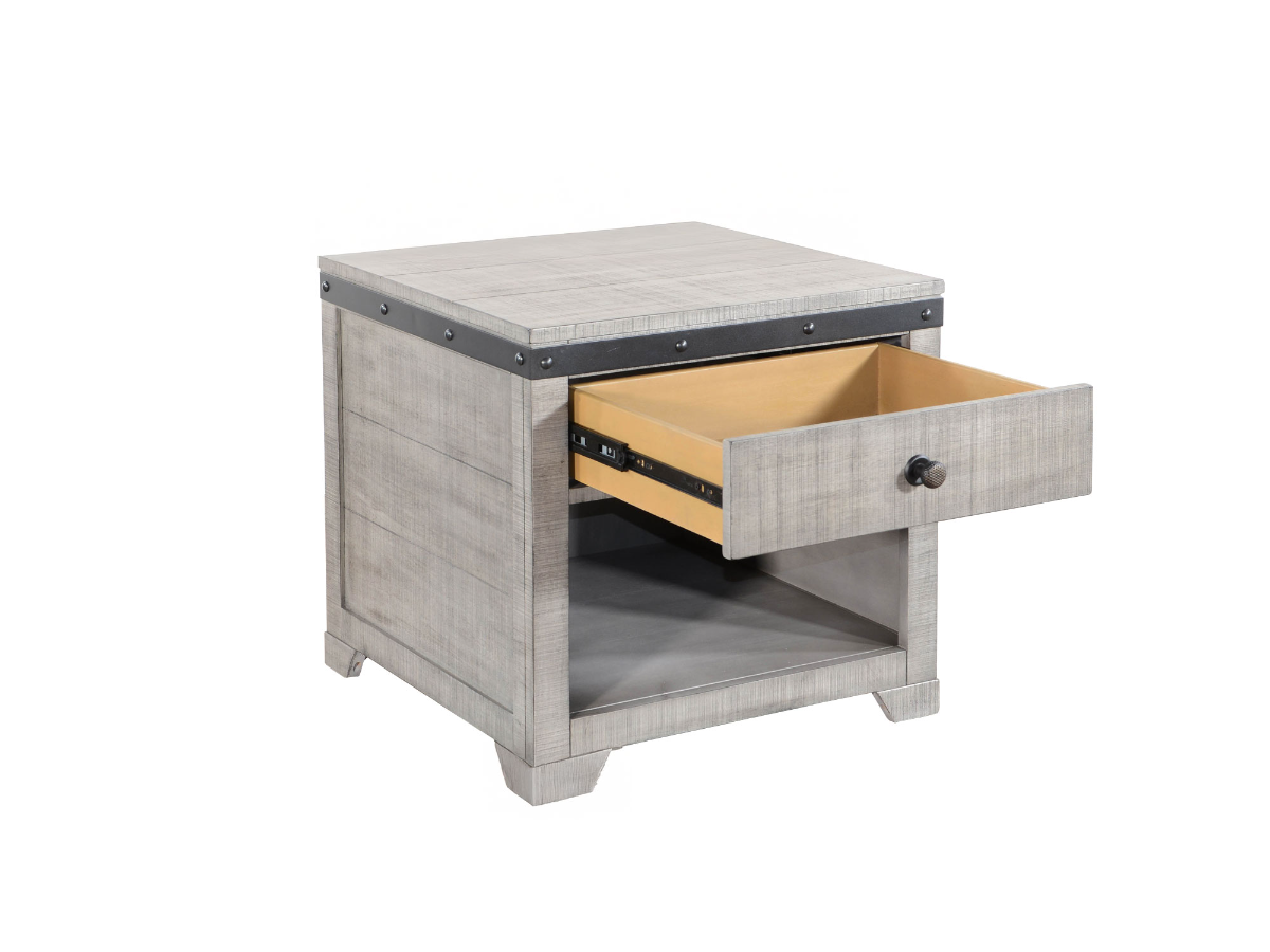 The Joshua End Table brings rustic character and functional design to your living space. Made from rough-sawn mahogany solids and veneers in a versatile gray finish, this end table features a dovetailed, felt-lined drawer for secure storage. A lower shelf provides additional space for décor or everyday essentials. Metal rustic detailing bands wrap around the top, adding a touch of industrial charm. Whether placed next to a sofa or accent chair, this table is a stylish and practical addition to any room.