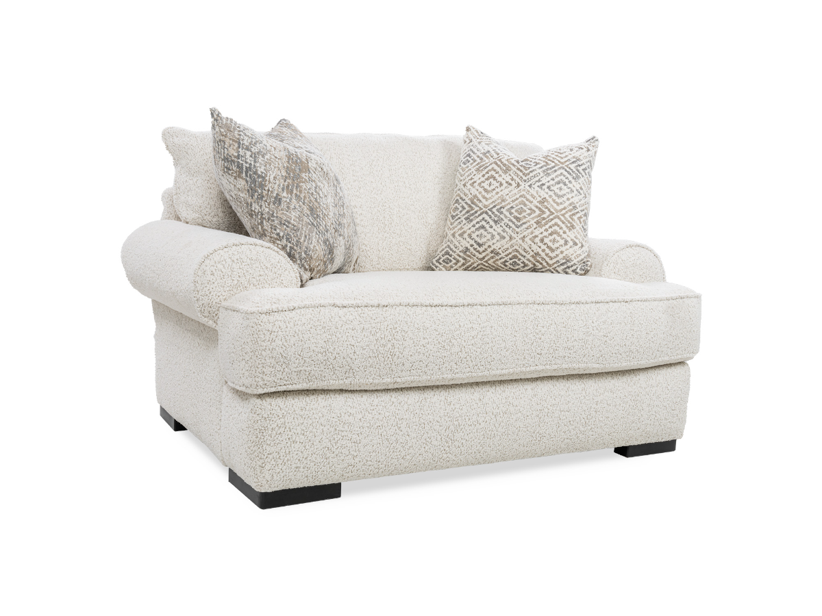Experience the perfect blend of style and comfort with the Juniper Chair and a Half. Designed in a casual transitional style, this chair features a 2-cushion frame with a rolled arm, creating a relaxed and inviting atmosphere in any room. Crafted with durability in mind, the frame is constructed of red oak solids and boasts a commercial-grade sinuous coil system for long-lasting support. The set includes plush throw pillows, filled with luxurious down, offering an extra layer of comfort and luxury. Whether you're lounging with a good book or enjoying quality time with loved ones, the Juniper Chair and a Half provides ample space and cozy seating. Elevate your living space with this fashionable and enduring chair that is sure to withstand the test of time while adding a touch of sophistication to your home.Read More