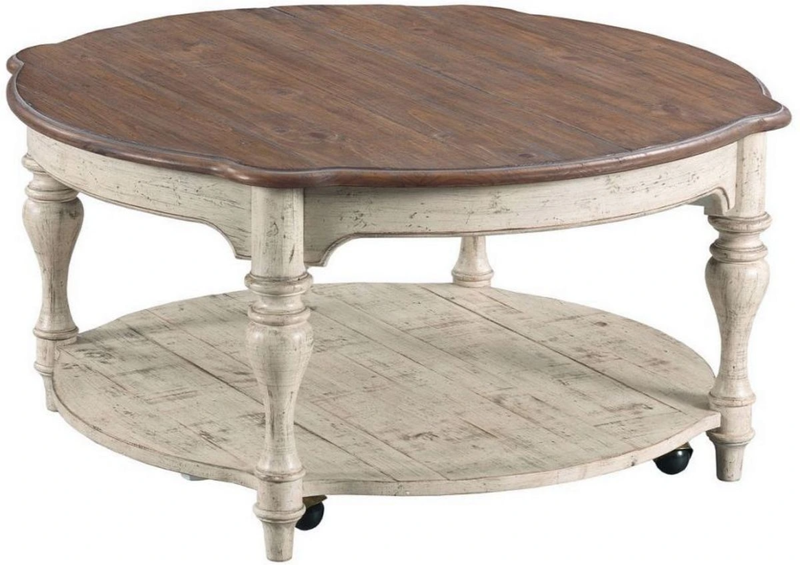 The Bolton Round Coffee Table is the subtle centerpiece of the Weatherford living room collection. Its relaxed, weathered personality is found in the authentic, individual pine boards and their rustic joinery. Turned posts support the top and a full solid wood shelf below. And tucked underneath each post is a caster.Read More