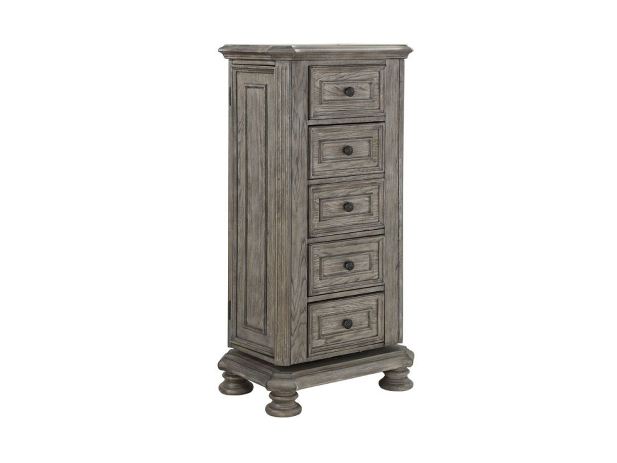 The Lakeway Lingerie Chest is a sophisticated and practical addition to your bedroom, combining style with functionality. Crafted in a sleek grey finish from poplar wood, this lingerie chest features five drawers, offering ample storage for delicate garments and accessories. The top drawer is adorned with a brown felt pad, providing a luxurious touch.Adding to its versatility, the Lakeway Lingerie Chest includes a side door with hooks, offering a convenient spot for hanging accessories or clothing. The inclusion of a mirror on one side enhances the functionality of the piece, making it a practical and elegant solution for your bedroom. Elevate your storage solutions with the Lakeway Lingerie Chest, where thoughtful design meets contemporary style.Read More