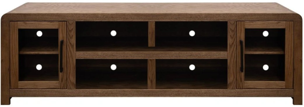 The Haven 82" TV stand combines modern casual design with curved edges and two glass doors. It offers ample storage and a warm bourbon finish, perfect for stylish entertainment spaces.Read More