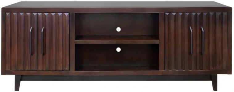 Sophisticated, modern style doesn't get better than the radiance 75 inch TV stand console. Artfully crafted from poplar solids and okume veneers, this showstopping entertainment center is available in two rich finishes and includes matte black hardware. The cabinet rests atop a sleek wood base with tapered legs and will accommodate TVs up to 85 inches.Read More