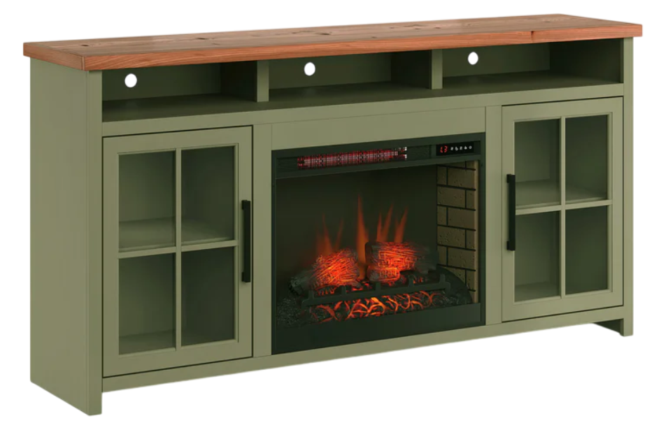 The Legends Home Vineyard 74" fireplace console in sage green and fruitwood brings warmth and style to any living space. Featuring a built-in electric fireplace, ample storage, and a charming two-tone finish, it combines cozy ambiance with functional design for a timeless, rustic look.Read More