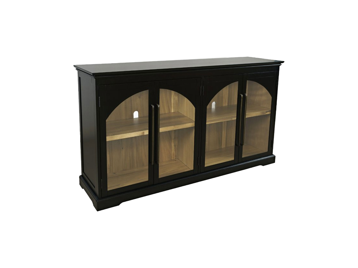 The Manning Black 65" Console is a striking and functional addition to your entertainment area. With its sleek black finish, this console exudes a sophisticated appeal that complements any modern decor. The console features four doors adorned with arched glass windows, offering a glimpse of the contents inside while adding an elegant touch to the design. Inside, you'll find two shelves that provide ample space to store media devices, gaming consoles, and other entertainment essentials. The dark metal hardware adds a touch of contrast to the overall look, enhancing the console's visual appeal. Moreover, the light contrasting interior wood creates a stunning backdrop for your entertainment equipment. Whether you're watching movies, gaming, or simply displaying decor, the Manning Black 65" Console effortlessly combines style and functionality to elevate your living space.