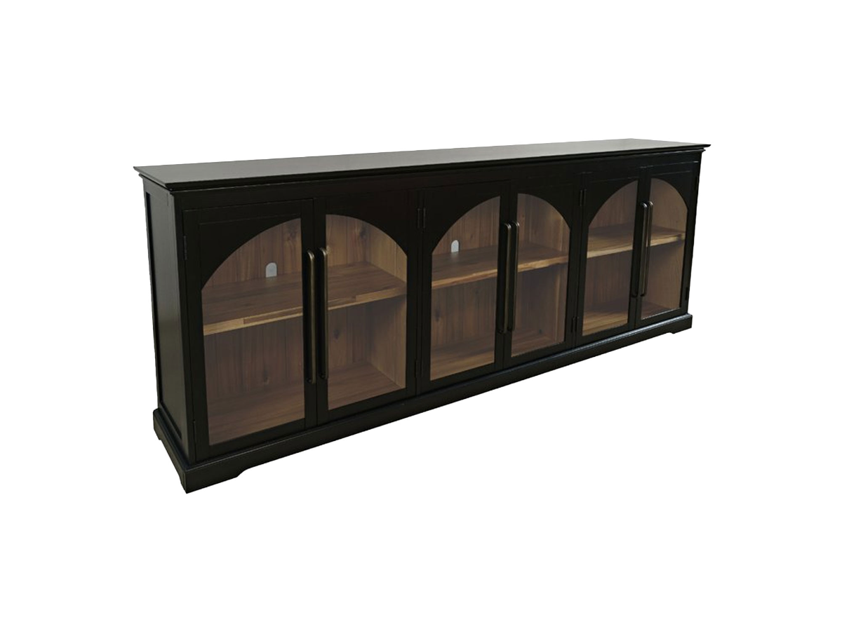 The Manning Black 96" Console is a striking and functional addition to your entertainment area. With its sleek black finish, this console exudes a sophisticated appeal that complements any modern decor. The console features six doors adorned with arched glass windows, offering a glimpse of the contents inside while adding an elegant touch to the design. Inside, you'll find three shelves that provide ample space to store media devices, gaming consoles, and other entertainment essentials. The dark metal hardware adds a touch of contrast to the overall look, enhancing the console's visual appeal. Moreover, the light contrasting interior wood creates a stunning backdrop for your entertainment equipment. Whether you're watching movies, gaming, or simply displaying decor, the Manning Black 96" Console effortlessly combines style and functionality to elevate your living space.