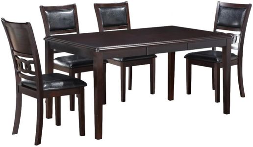 Comfortable dining or counter chairs have full foam seat cushions and back rests upholstered with black pu. Gia’s signature interlocking chain design on the chair back gives this welcoming dining set a touch of sophistication. The multi-step deep ebony finish accents the beautiful wood grains. With a wide variety of table styles and heights to choose from, you can find the perfect option for your home. Choose from small-space seating for 2 to family friendly seating for up to 6, in standard and counter height sizes. Drop leaf, bookcase shelves and display shelves make each Gia dining set unique. Find the perfect gathering place for your home with the New Classic Gia Dining Collection.
