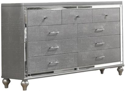 Discover the Valentino 9 Drawer Dresser in timeless Silver—a marvel of durable craftsmanship crafted from a blend of manufactured and solid woods, adorned with exquisite embossed inlays. Radiating with glitz and glam, its gleaming finish, mirrored trims, crystal-studded drawer pulls, and alligator-embossed accents capture the essence of Hollywood allure.Read More