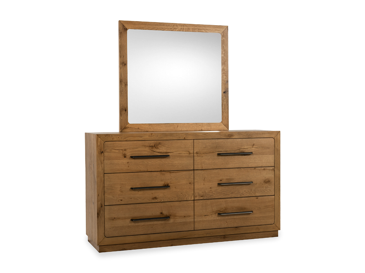 The Oakley Dresser and Mirror set brings functional storage and rustic character to your bedroom. Featuring a rich rustic oak finish that emphasizes the bold wood grain, this six-drawer dresser is built from sturdy rubberwood and accented with Okoume veneers for a warm, natural look. The clean design is enhanced by black metal pulls, giving the set a subtle modern edge while maintaining a timeless appeal. Topped with a large, framed mirror, this set not only completes the look but also adds brightness and visual depth to your space.Read More