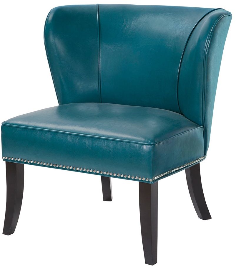 This concave armless chair featuring a crisp look of peacock blue faux leather, and individual nail head detailing definitely makes a stylish contemporary statement. Leg assembly required.