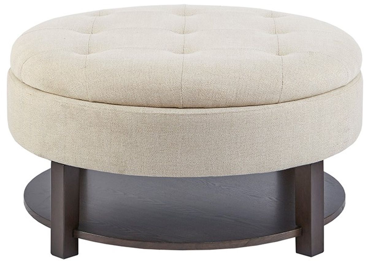 There is no need to sacrifice style for storage with this round storage ottoman. Featuring a tufted top that lifts to reveal ample interior storage space, this round ottoman centralizes the clutter and becomes a stylish addition to your living room. There is also an additional veneer shelf to store magazines and newspapers. Leg assembly is required.
