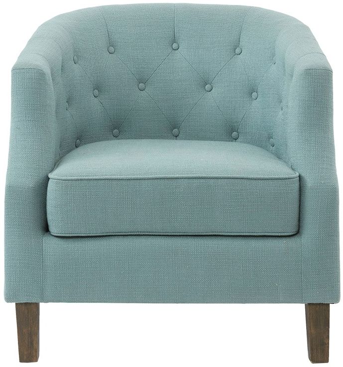 With graceful curves, the Madison Park Ansley Chesterfield Barrel Chair offers a comfortable update to your space. Button tufting details add an elegant touch to design, while the deep seat and removable cushion provides incredible comfort. A dark coffee wood finish on the straight legs contrasts beautifully with the dusty aqua upholstery. Expertly crafted, this chesterfield barrel chair brings a luxurious transitional look to your living room decor. Leg assembly required.