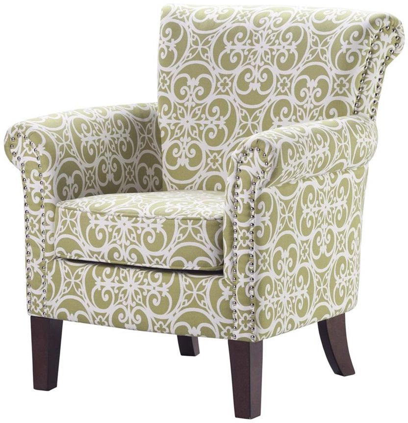 Add an eye-catching touch to your living room with the Madison Park Brooke Tight Back Club Chair. This accent chair features an all-over fretwork pattern on the green-hued upholstery that creates a stunning transitional look. A bronze nailhead trim on the front of the arms and the sides of the back add an elegant accent to the design.Read More
