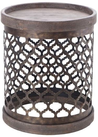 This reclaimed gray transitional drum table with a quatrefoil metal base pattern, makes for an excellent conversation accent piece. No assembly required.