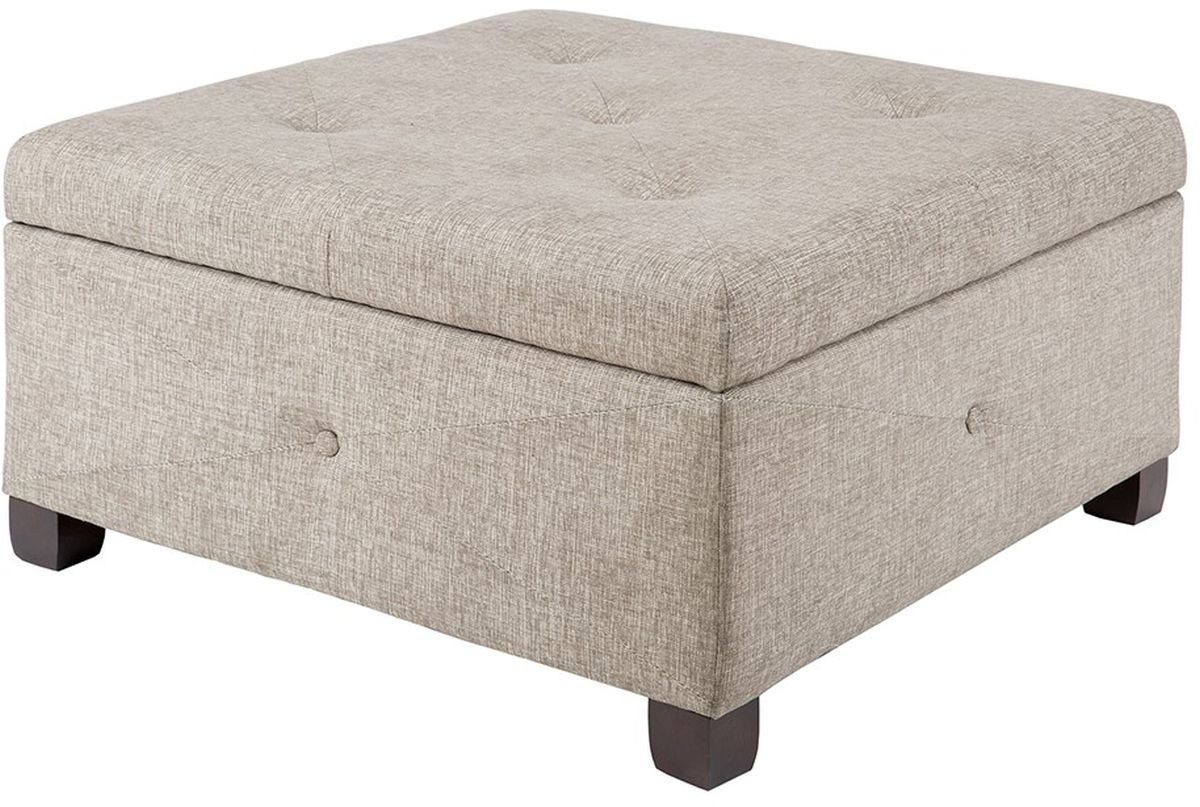 The Madison Park Aspen Ottoman offers a versatile storage option that’s full of style for your home. This square storage ottoman is upholstered in a sand color fabric and features button-tufted details on the top and sides that add an elegant touch. Solid wood legs with a dark brown finish complement the upholstery.Read More