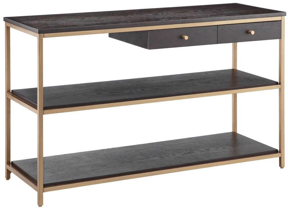 The Martha Stewart Holls Console offers the perfect combination of functionality and style for your home. This console features a solid wood veneer top and shelves in dark morocco finish that creates a rich modern look. The antique gold metal frame adds an elegant touch, highlighting the dark finish for a striking contrast. A drawer at the top right of the console provides additional storage.Read More