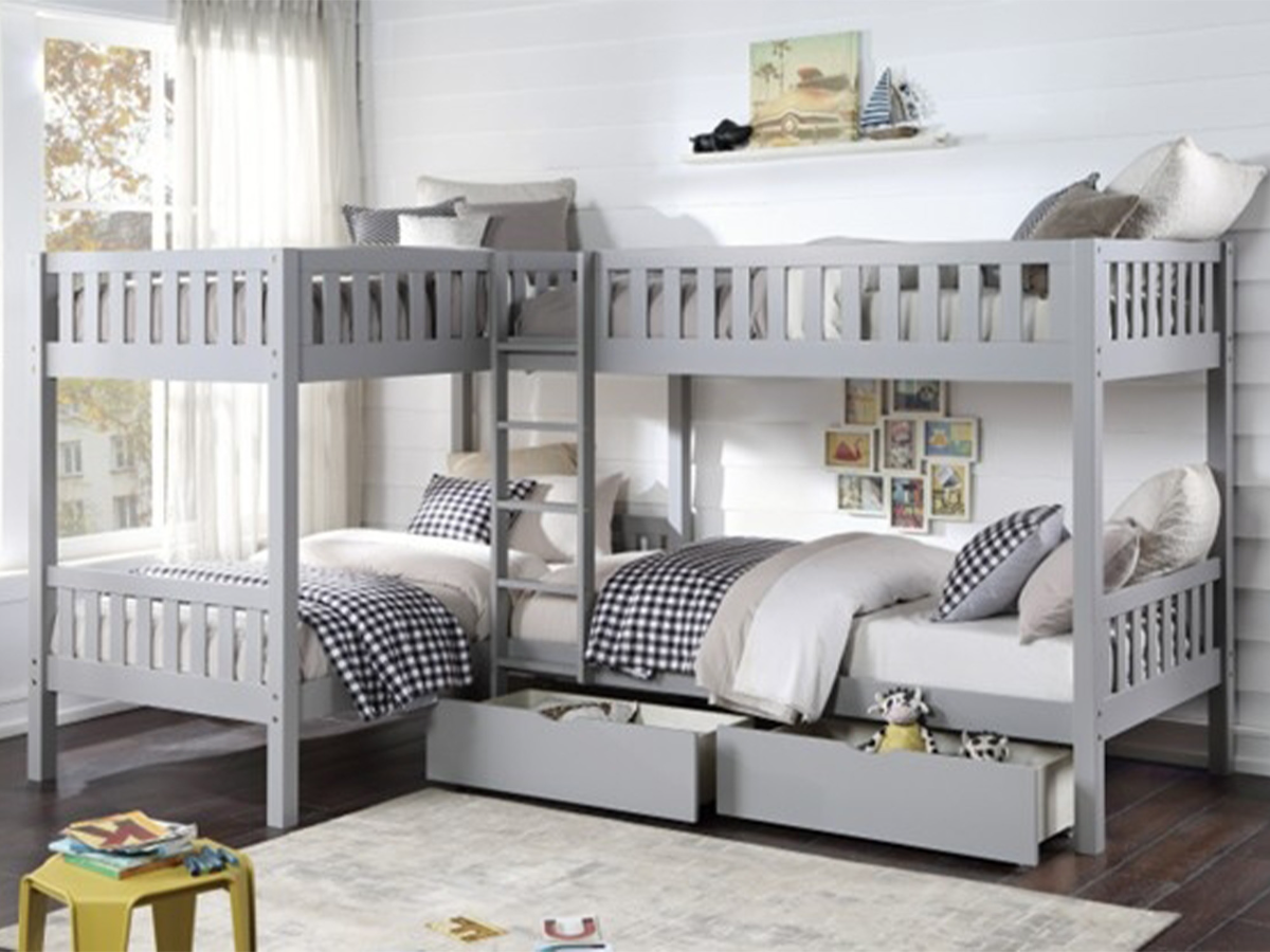 Crafted from durable wood and engineered wood, the Ophelia bunk ensures lasting support and stability. Two roomy caster-supported storage drawers beneath the bottom bunks offer convenient space to tuck away clothes, bedding, or toys. No foundation is required, thanks to its sturdy platform construction. Whether for siblings sharing a room or creating the perfect setup for guests, the Ophelia 4 Bed Twin Corner Bunk delivers comfort, convenience, and style all in one smartly designed package.