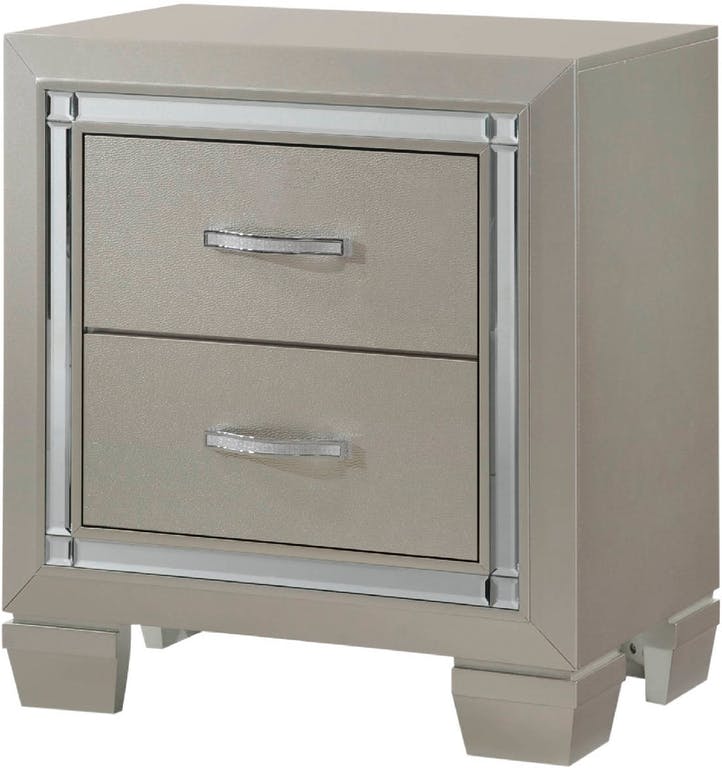 The Platinum Nightstand is a glamorous and stylish addition to any youth bedroom. Crafted from engineered wood, this nightstand features embossed drawer fronts that add texture and visual interest. The champagne color brings a touch of elegance to the piece. Adding to its luxurious appeal, the nightstand is adorned with shiny mirror trim that provides a reflective surface and enhances the overall aesthetics. The crystal-accented handles on the two drawers contribute to the sophisticated design, adding a touch of sparkle. With its combination of chic design elements and functional storage, the Platinum Nightstand is a perfect companion for a youth bedroom, offering both style and practicality in a single piece of furniture.