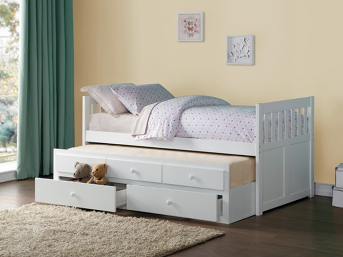 The Rebecca Twin Bed with Trundle offers classic charm and multifunctional convenience in a crisp white finish. Featuring a slatted headboard and footboard, this timeless twin bed brings a clean, airy feel to any youth or guest bedroom. Beneath the main bed, a pull-out twin trundle provides a perfect extra sleeping spot for sleepovers or siblings, while maintaining a compact footprint. Its bright finish and traditional design make it easy to coordinate with a variety of room styles.Read More