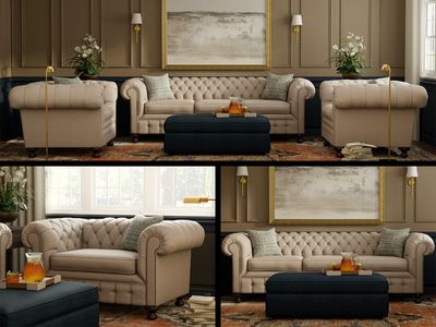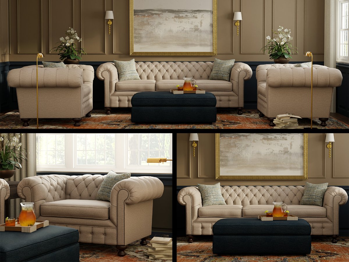Coordinated sofa, chair, and ottoman set with timeless chesterfield inspired design