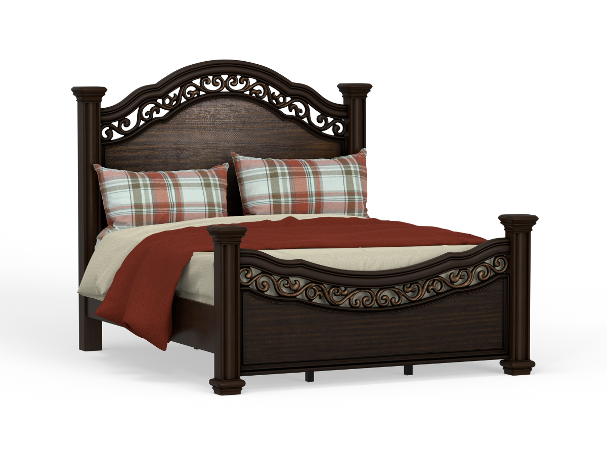 Both the headboard and footboard are adorned with intricate filigree designs, enhanced by metallic paint accents that bring out the depth and detail of the craftsmanship. These ornamental touches add a regal feel and create stunning visual contrast against the darker wood finish. The Rockwell Bed is ideal for those who appreciate traditional elegance with a touch of artistry, offering timeless style and sturdy construction that stands out in any master suite.