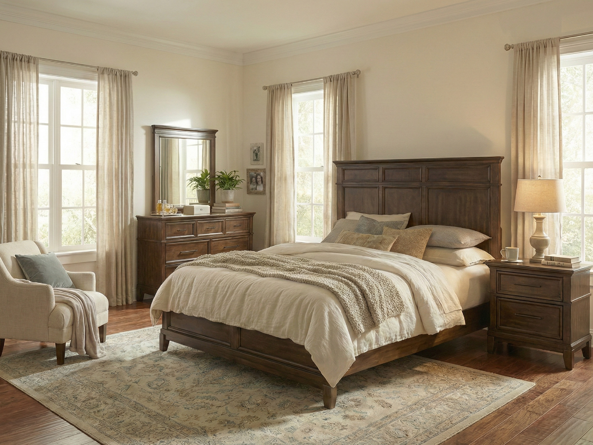 Complete bedroom solution with matching bed, dresser, and mirror