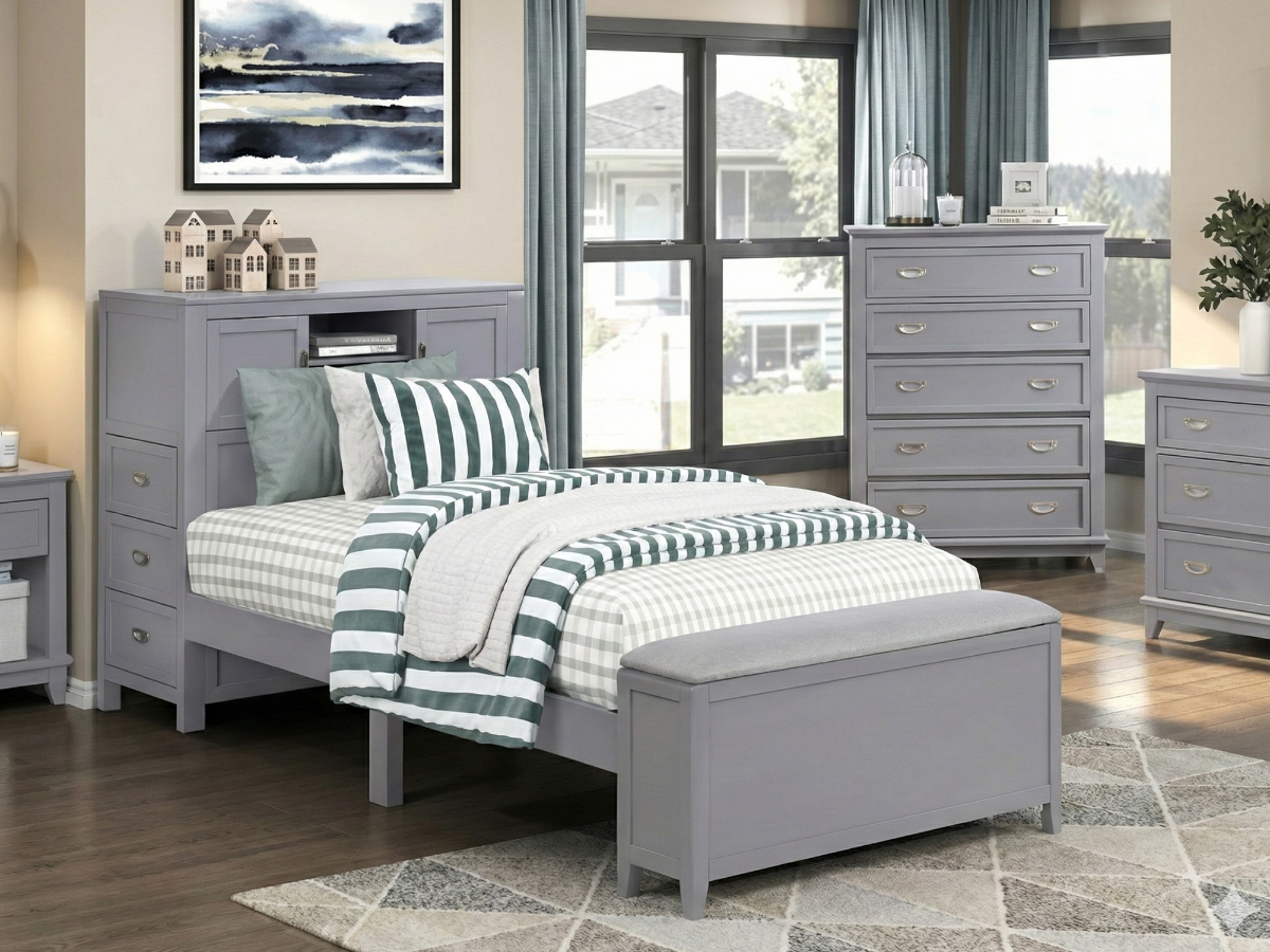 The Samuel Full Bookcase Platform Bed combines modern design with exceptional functionality, making it the ideal centerpiece for any contemporary bedroom. Crafted from wood and engineered wood in a sleek gray finish, this full-size bed offers a smart use of space with integrated storage and workspace features. The bookcase headboard includes open shelving and three dovetail drawers, perfect for keeping books, electronics, and personal items neatly organized. Polished nickel-tone flush ring pulls add a subtle, stylish contrast to the clean lines of the frame.Read More