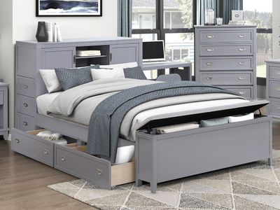 The Samuel Twin Bookcase Platform Bed is a sleek and modern solution for maximizing space in any bedroom, especially where smart storage is a must. Finished in a clean, contemporary gray, this bed is crafted from wood and engineered wood for strength and stability. The built-in bookcase headboard offers convenient open storage and three dovetail drawers, perfect for keeping books, chargers, or personal items organized and within reach. Polished nickel-tone flush ring pulls add a stylish accent to the bed’s streamlined design.Read More