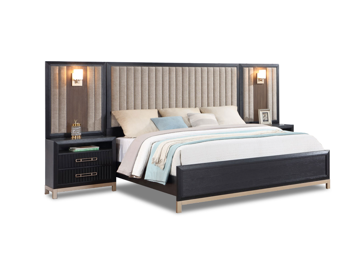 The Scarlet Wall Bed is a stunning and space-saving solution for your bedroom. Available in both King and Queen sizes, this wall bed comes in a sleek black color with elegant gold legs and detailing, adding a touch of luxury to your space. The highlight of this wall bed is its upholstered cream-colored headboard and nightstand panels, which create a striking contrast against the black frame. The bed comes with attached nightstands, each featuring two drawers and an open shelf for convenient storage and display. A paneled wall is also included, creating a cohesive and stylish look in your bedroom. Sconce lighting is integrated into the wall, providing soft and ambient illumination for your nighttime reading or relaxation. The Scarlet Wall Bed not only offers a comfortable sleeping space but also adds a touch of sophistication and functionality to your bedroom, making it an excellent choice for those looking to maximize their space without compromising on style.