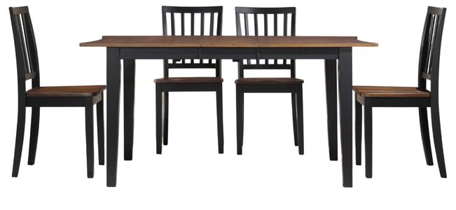 Paired with four schoolhouse-inspired side chairs, finished in coordinating walnut and ebony tones, each scooped seat offers comfort while solid wood construction ensures lasting durability. Perfect for dining rooms or cozy spaces, Joplin delivers warmth, strength, and classic appeal.