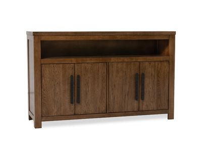 Below, four doors provide concealed storage for dishes, serving pieces, or table linens, while an open cubby above adds space for quick-access items or decorative display. The server is finished with unique black metal hardware that features a striated texture, adding a layer of visual interest and modern flair. Built for both beauty and practicality, the Stillwater Server makes a powerful style statement in any dining room.