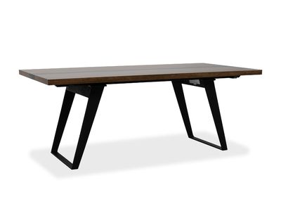 The black legs are angled outward and connected at the base on each side, adding a sculptural element and strong support. The combination of rich wood tones, sleek black accents, and glossy textures creates a balanced blend of warmth and modern sophistication. Perfect for everyday dining or special gatherings, the Stillwater Dining Table offers both statement-making style and durable craftsmanship.