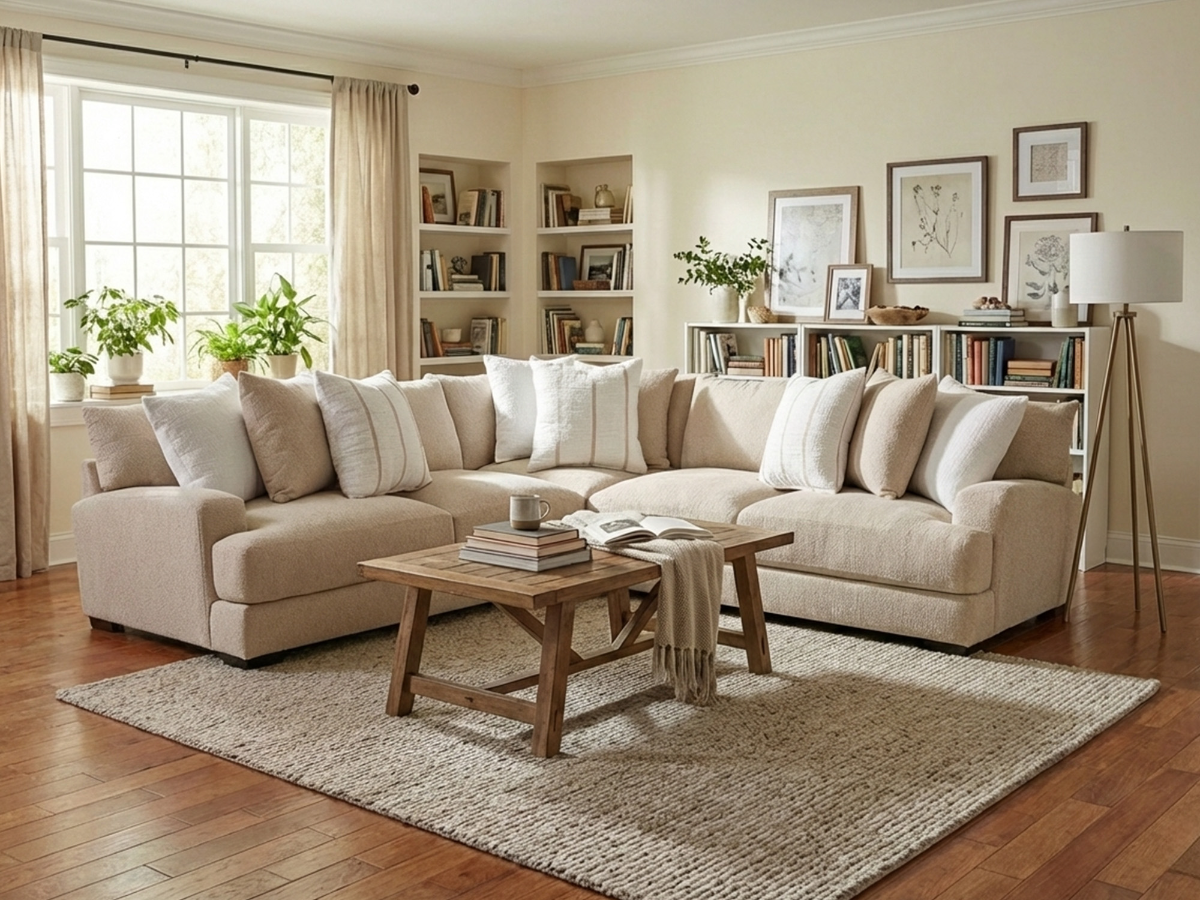 The Summer 3 Piece Sectional combines casual elegance with lasting comfort, creating a beautiful centerpiece for your living space. Upholstered in a soft cream fabric, this L shaped stationary sectional brightens any room and pairs easily with a wide range of décor styles. It includes coordinating throw pillows, some in crisp white and others with a simple classic stripe pattern, adding texture and a designer touch to the look. Designed with clean lines and a generous seating area, it is perfect for family gatherings or relaxing nights in.Read More