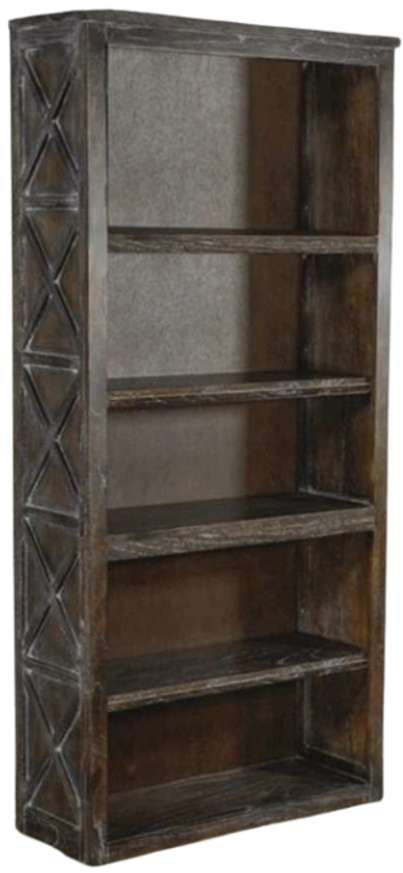 Complete your bedroom with this beautiful bookcase in European Cottage finished. This bookcase includes X shaped overlay moldings throughout, mindi top, mahogany bases solids and veneers, and works well in small spaces!