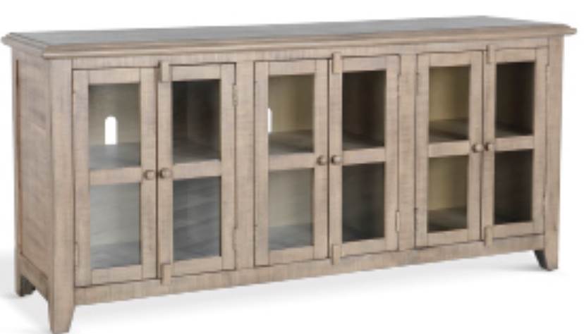 Enhance your entertainment area design by incorporating this TV console, shown in beach pebble finish. This 70" TV console was built with rough-sawn mahogany solids and veneers, glass doors, and adjustable shelves.Read More