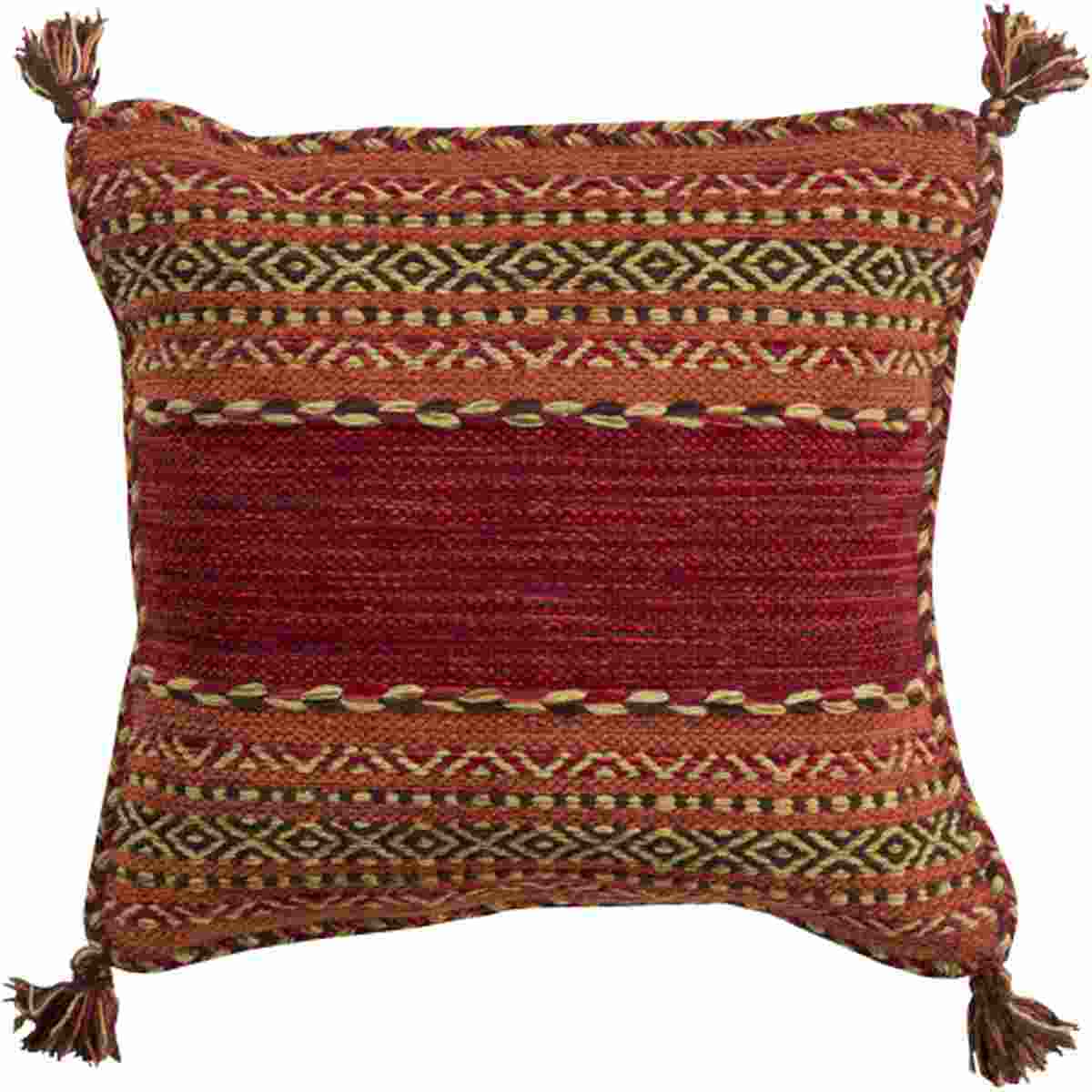 The Trenza Dark Red 22" x 22" Toss Pillow from Surya features a tassel design and is made in IndiaRead More