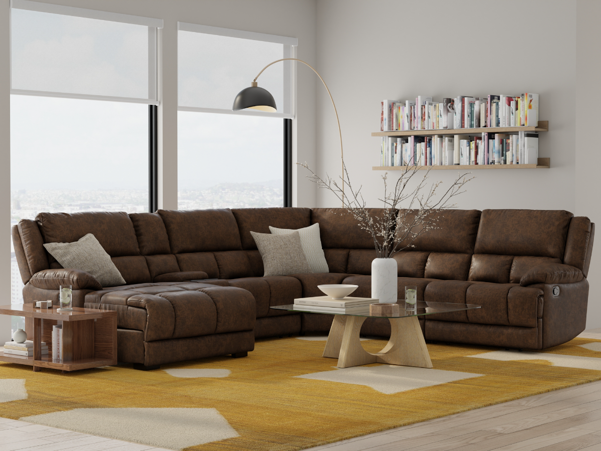Practical functionality is at the heart of the design. The storage chaise provides a convenient spot to keep blankets, pillows, or remotes tucked neatly away, and includes USB Type A and Type C charging ports on its side for easy device charging. The sectional also features a storage console with built-in cup holders for added convenience. With manual recline functionality, you can relax and recline at your own pace. Combining sturdy construction, modern conveniences, and classic style, the Texas 6 Piece Sectional offers both comfort and practicality in one versatile package.
